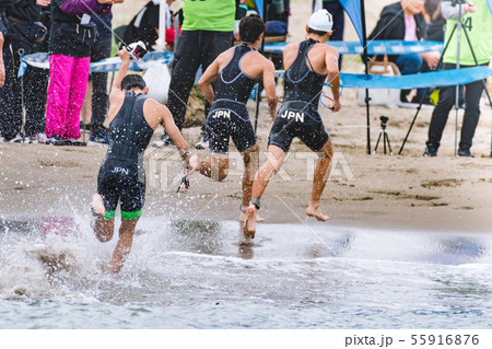 トライアスロン女子スイムフィニッシュで砂浜にあがる女子選手