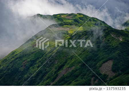 北アルプス・樅沢岳から見る雲湧く弓折岳稜線と鏡平