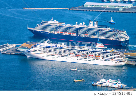 日本の横浜都市景観 出港するノールダムを望む。手前は飛鳥Ⅱ(シーボーン・クエストが初入港)=30日