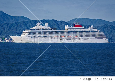 山並みをバックに朝の博多湾を航行する新型クルーズ船飛鳥III