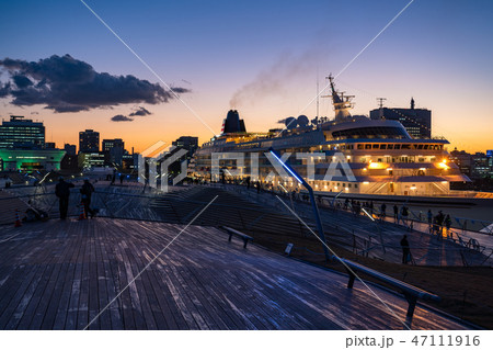 日本の横浜都市景観 大さん橋の飛鳥Ⅱなどを望む