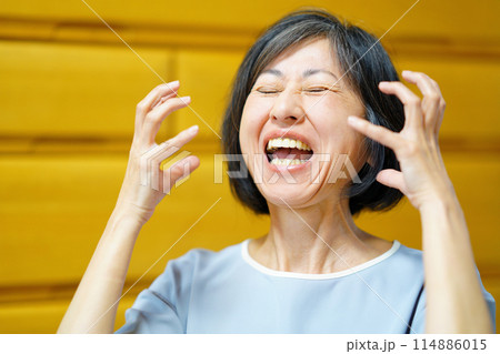 四つん這いで悔しく歯を食いしばって泣いている高齢の女性