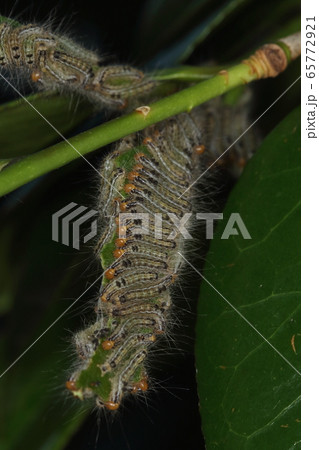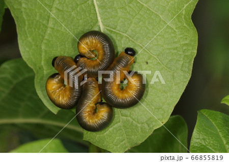 生き物 昆虫 コブシハバチ、食事中の幼虫。背中が灰色でお腹が黄色の塗分け、ゴロンとしたイモムシ