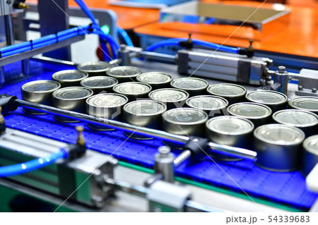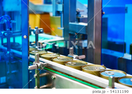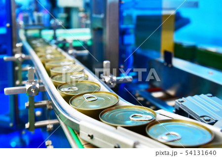 Canned food products on conveyor belt in distribution warehouse.parcels transportation system concept.