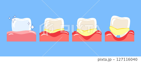 Periodontal disease . Included gingivitis, dental calculus, gum recession and food stuck in teeth . Cartoon illustration . Isolated on blue background . Vector .