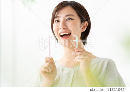 デンタルフロスで掃除をして喜んでいる歯のキャラクター