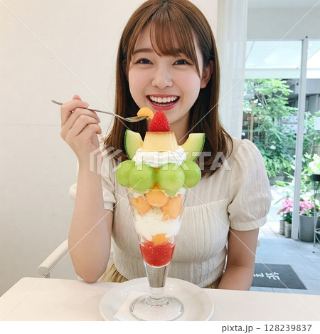 旬のフルーツパフェと笑顔の女性|イチゴ、カフェ、メロン、マンゴー、夏、贅沢、幸せなひととき