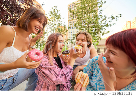 Group of young friends laughing and sharing donuts outdoors in sunny urban park