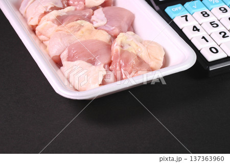 トレーに入った若鶏もも肉のぶつ切りと電卓