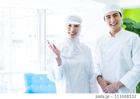 食品加工の仕事をする調理員の男女(食品衛生,食品工場,衛生服,衛生管理)