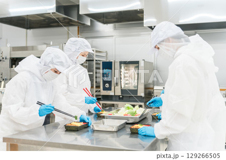 クリーンスーツでお惣菜を詰める若い女性