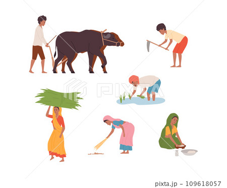 Indian rural farmers, traditional agricultural work ploughing field with bulls, planting rice, woman cooking vector set