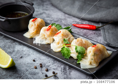 steamed dumplings with herbs, chili and soy sauce