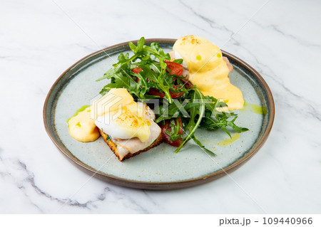 breakfast of arugula and tomato, toast with cheese and poached egg, top view