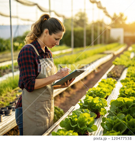 woman gardener with tablet in greenhouse