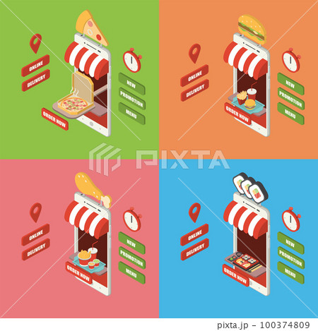 Isometric online food delivery smartphone set