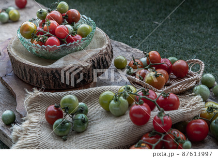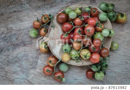 Group of Colorful variety of Fresh wild tomatoes (Mini Cherry Tomatos) on old wooden board background.