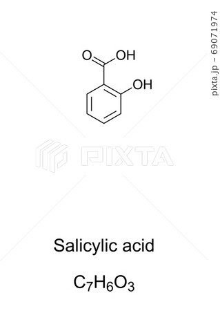 Salicylic acid chemical structure. Used in organic synthesis as plant hormone. Active metabolite of aspirin. Key ingredient in topical anti-acne and skincare products. Illustration over white. Vector.
