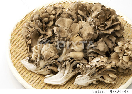 白バックで盆ざるに置いたマイタケ