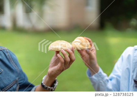 Close-Up of Couple Sharing Pastries in a Green Outdoor Setting