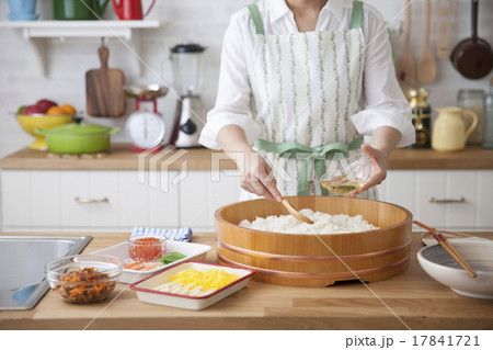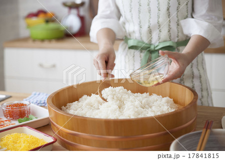 ご飯に酢を回しかけて酢飯を作る女性