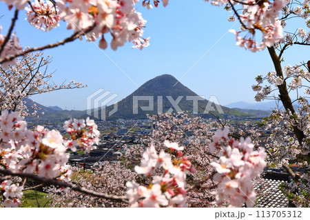 【香川県】桜咲く春の丸亀城より眺める丸亀市の町並みと飯野山(讃岐富士)