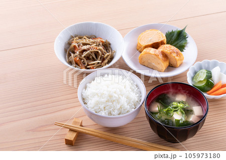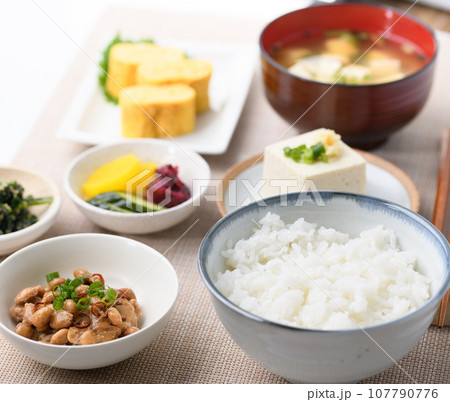 日本食 和食の朝ごはん (朝食イメージ)納豆、味噌汁 卵焼き めざし 漬物 豆腐
