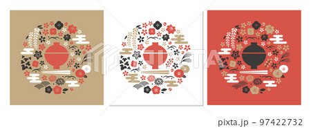 和食イメージと植物の円形デザイン3パターン