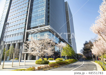 満開の桜と飯田橋グラン・ブルーム(飯田橋サクラテラス)のビルディング