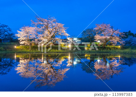 田んぼの水鏡に映る夜桜の駅