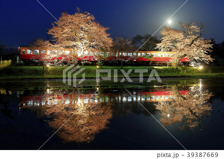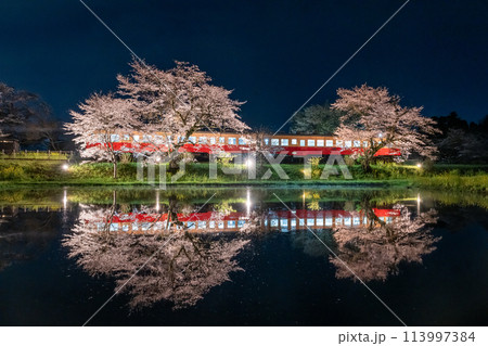 飯給駅で停車中の列車と桜ライトアップそしてリフレクション