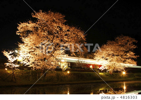 夜桜ライトアップの小湊鉄道と満月