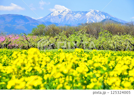 丹霞郷の菜の花と桃の花と黒姫・妙高山と桜遠景