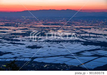 《新潟県》越後平野の夜明け・水鏡の田園風景