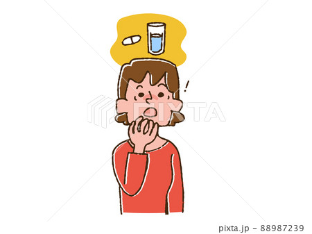 薬を飲み忘れたことに気がついた女性 コミカルな手書きの人物 ベクター、線画にカラー