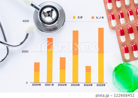花粉飛散量の推移グラフと聴診器と薬と目薬