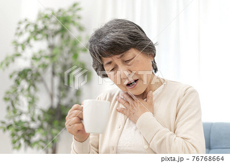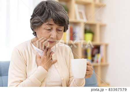 飲み込み辛いシニア女性 嚥下障害