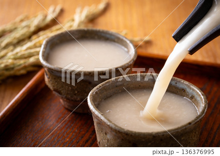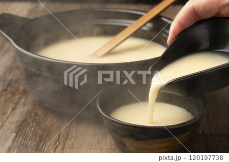 甘酒 温かい甘酒を湯呑みに注ぐ