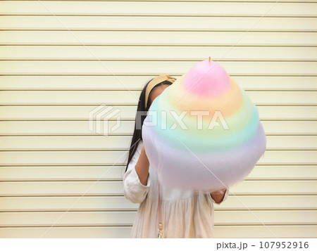 顔と同じくらい大きな綿あめを食べる女の子