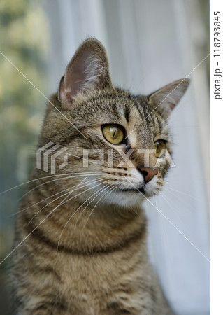 cute striped cat is sitting on balcony. Portrait of brown colored pet. Striped cat close-up