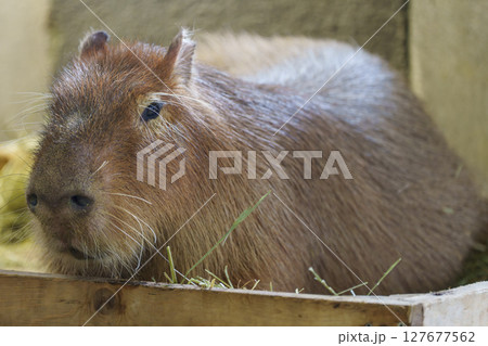 木箱の中でくつろぐカピバラのアップ