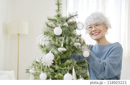 クリスマスツリーの飾り付けをする家族 母と父と娘と赤ちゃん