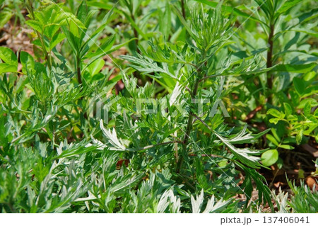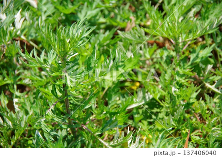 Artemisia indica var. maximowiczii よもぎの若葉と花の水彩イラスト