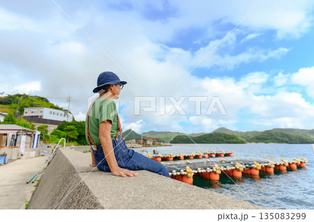 漁港で休む年配の男性