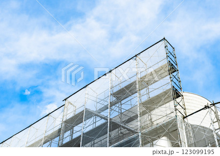 修繕工事中の建物に掛かる足場 高彩度コントラスト