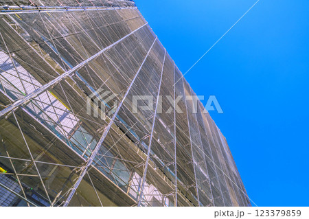 ビル改修工事 枠組み足場と青空