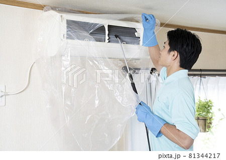 フェイスシールドをしてエアコンの清掃をするハウスクリーニングの作業員