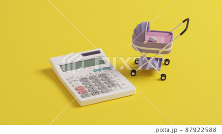 平面上に置かれたミニチュアのベビーカーと電卓の3Dレンダリングイラスト