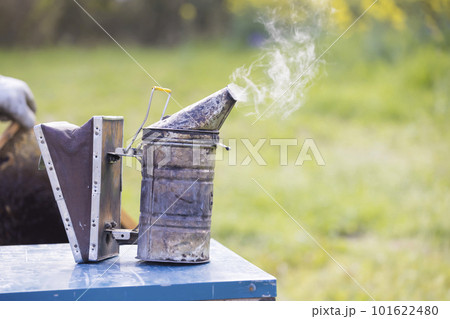 養蜂イメージ 巣箱の上に置かれた燻煙器