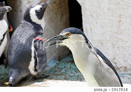 上野動物園のケープペンギンと餌の横取りを狙うゴイサギ